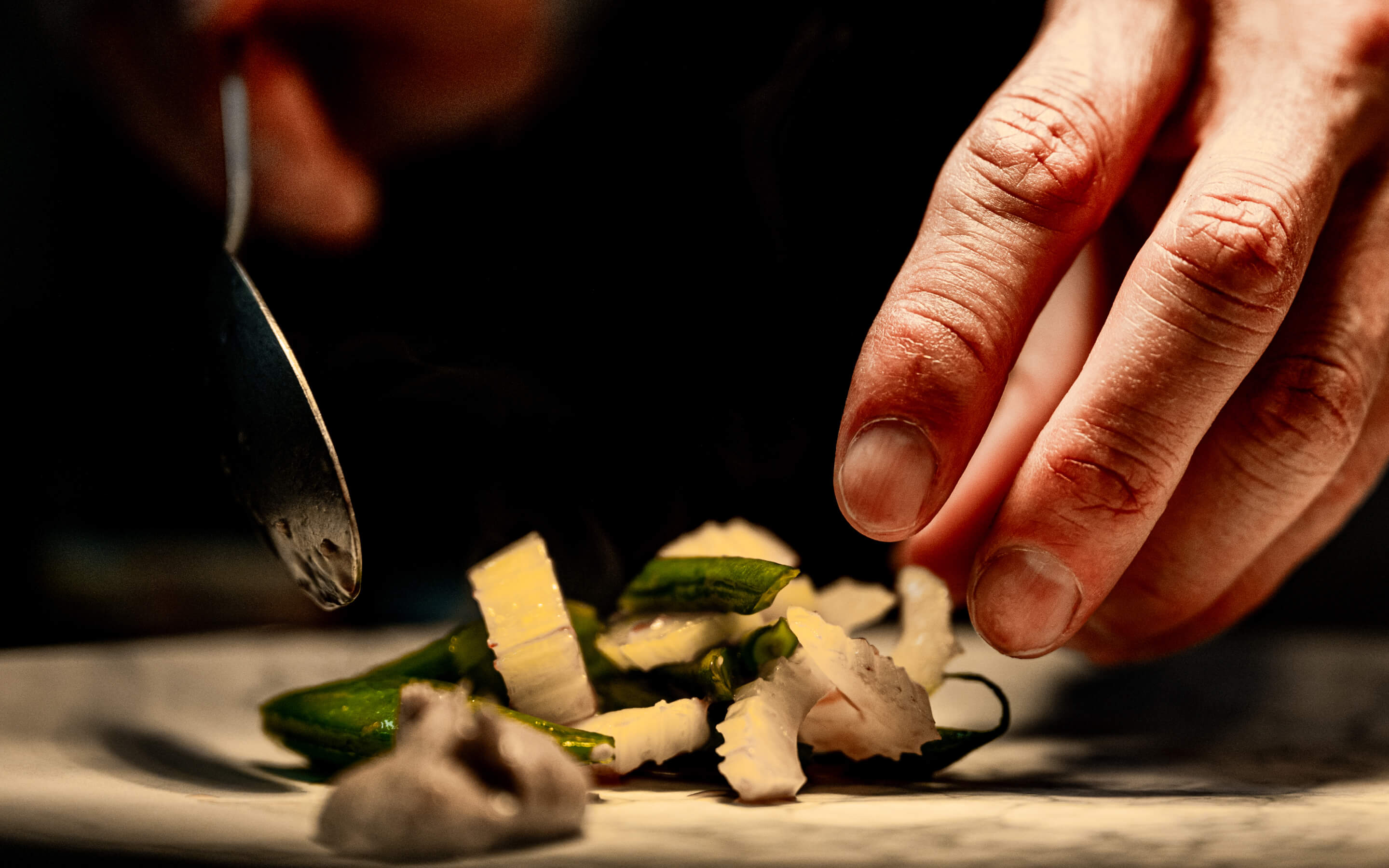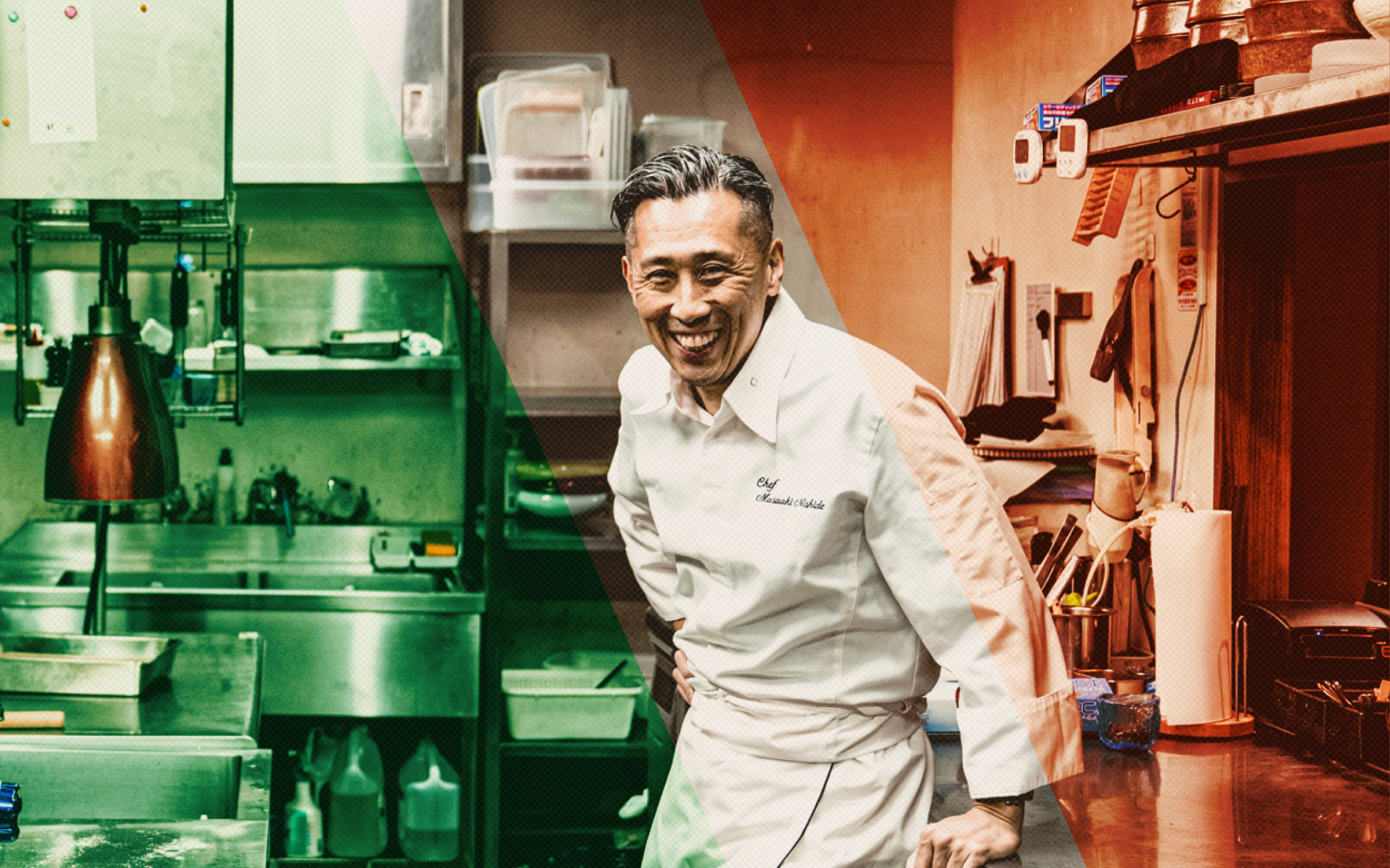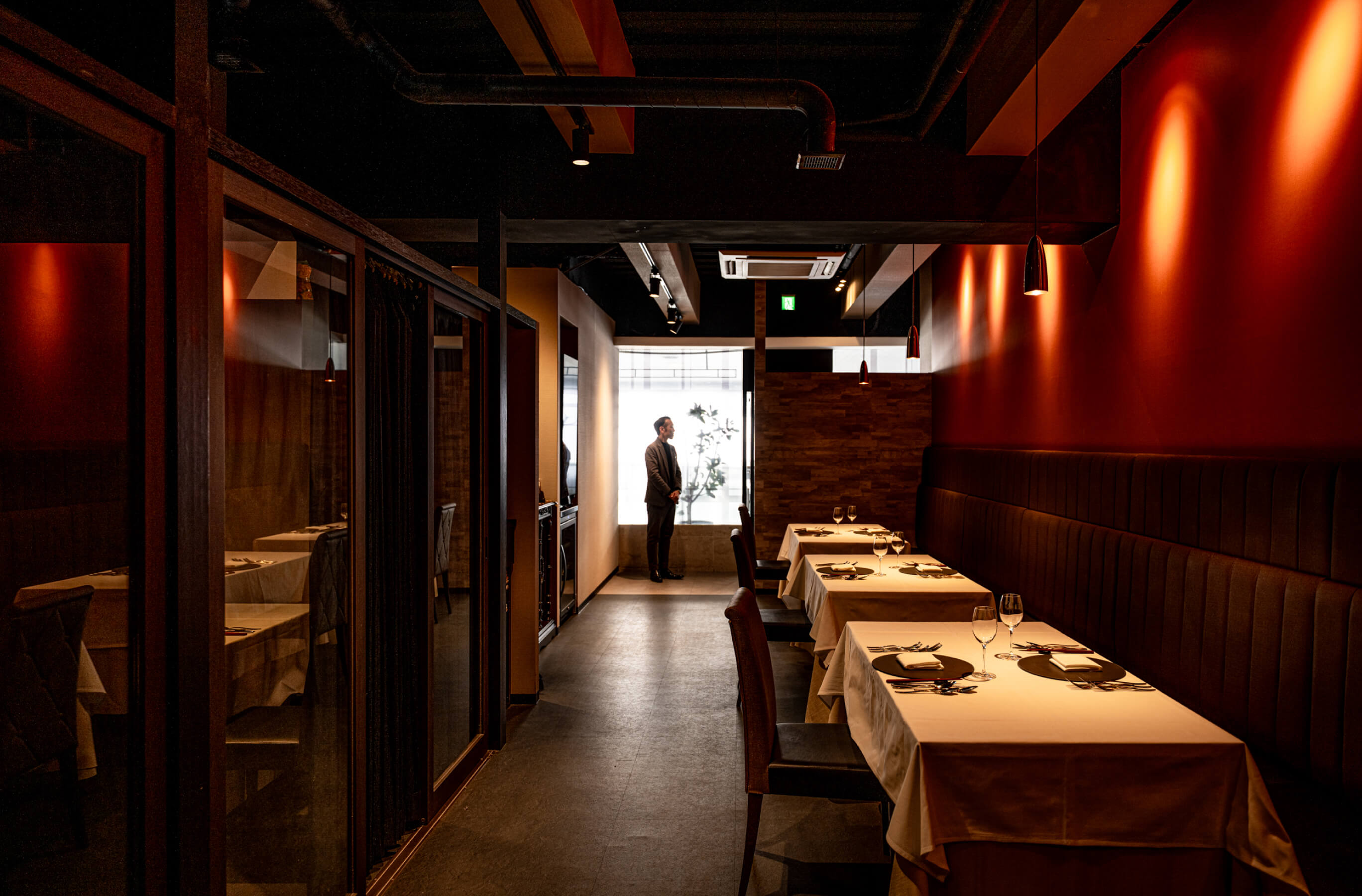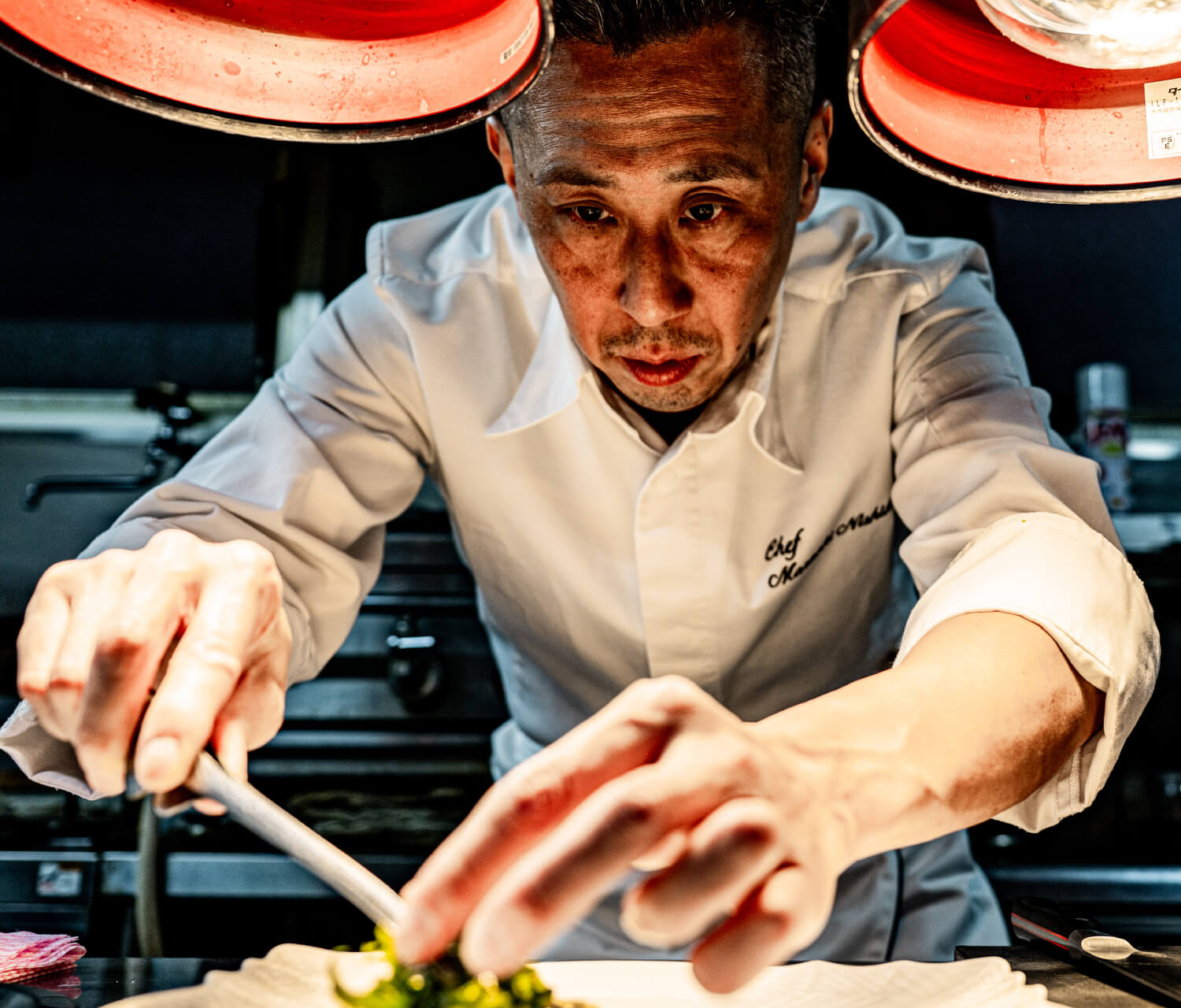 東大阪市生まれ。18歳から料理の道に入り、ザ・リッツ・カールトン大阪などで経験を積んだ、現場主義の叩き上げ料理人。